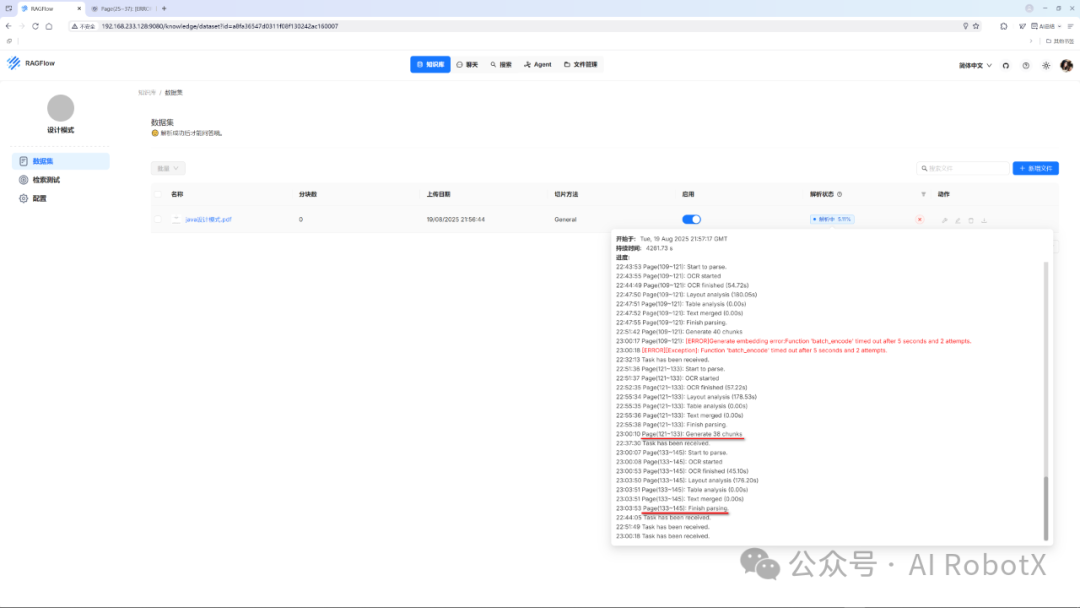 问题2:构建知识库时,上传文档在解析过程中报错:Page(109~121): [ERROR]Generate embedding error:Function ‘batch_encode’ timed out after 5 seconds and 2 attempts.