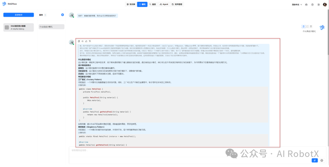 在右下角我们输入提示词:什么是设计模式,按Enter回车键 或者 点击右下角的“搜索”小箭头图标,看看Agent表现效果如何,具体如下图所示: