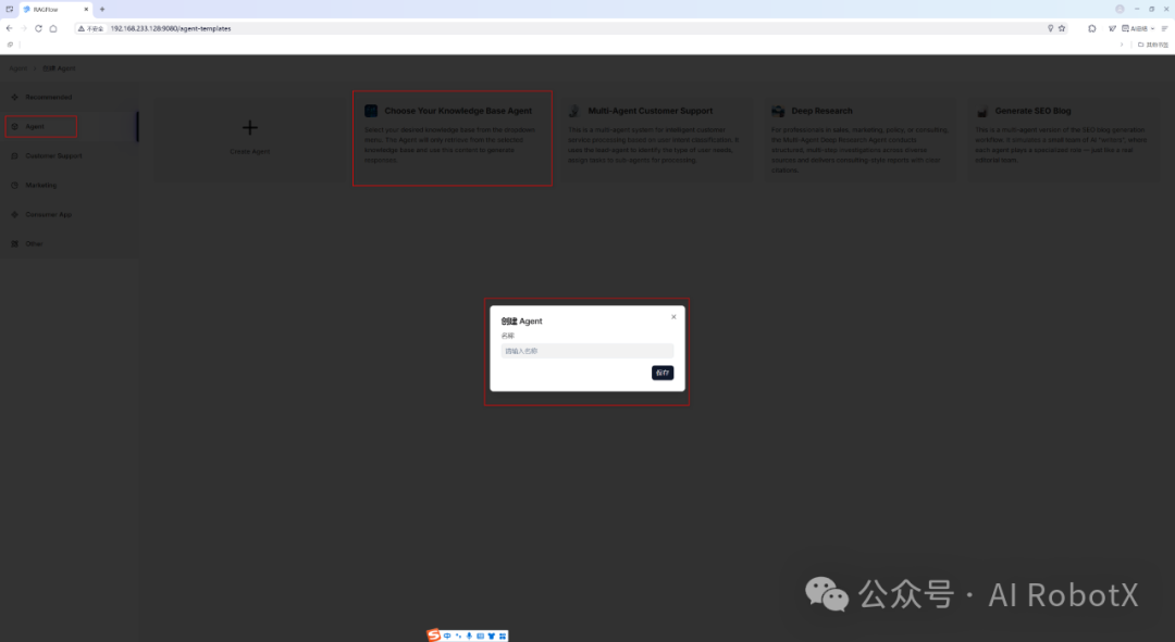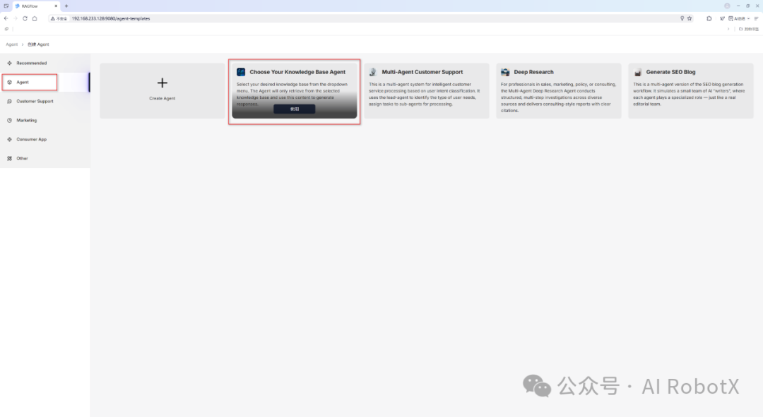 接着,我们选择 RAGFlow 内置的一个基于知识库检索问答Agent模版,如下图所示: