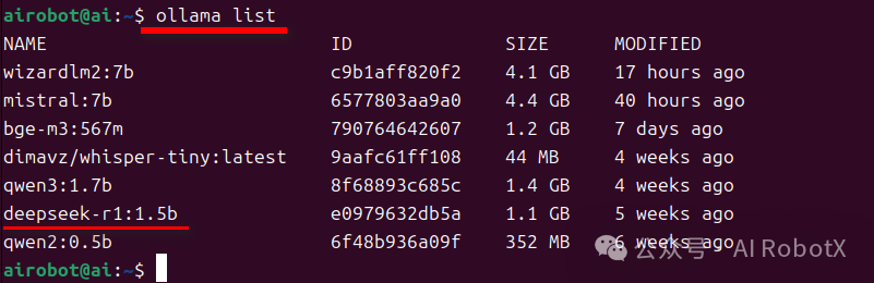 模型名称: 这里配置为 deepseek-r1:1.5b,注意:必须与执行命令行 ollama list 输出的大模型名称Name保持一致。具体查看ollama已安装的大模型列表,如下图所示: