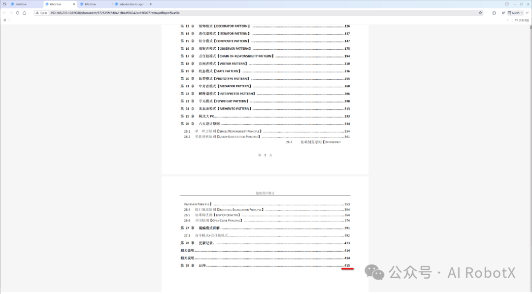 点击上图中“操作”这一列下面的小眼睛图标,即可支持在线预览已上传的文件内容,如下图我们可以清楚的看到,已上传解析处理的《java设计模式》pdf文档,共计有415页。