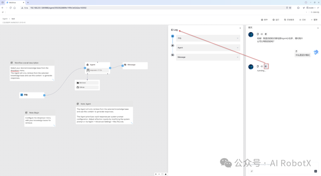 在running…的紧挨着的上方右侧第一个“笔记本”小图标按,支持点击查看Agent实时运行日志Log,如下图所示: