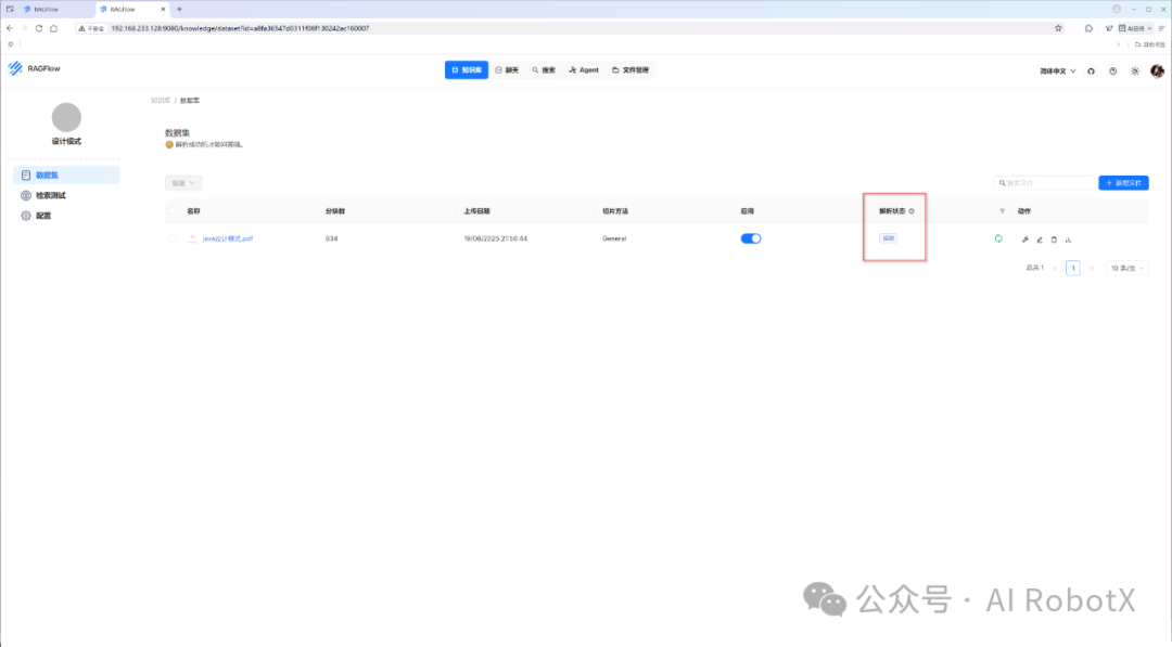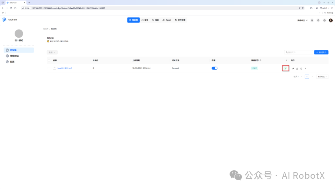 在上述配置完毕后,我们就可以点击“解析”按钮,此时会弹出一个“操作成功”的提示,RAGFlow 就正式开始处理上传的文档了。具体如下图所示: