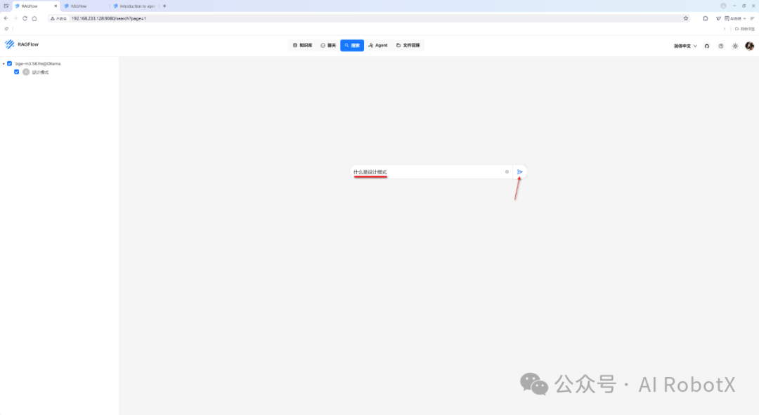 我们点击顶部导航栏中的“搜索”菜单项,确保左侧已勾选了本地RAG知识库——设计模式,此时我们提出相同的一个问题:什么是设计模式,点击“搜索”图标,如下图所示: