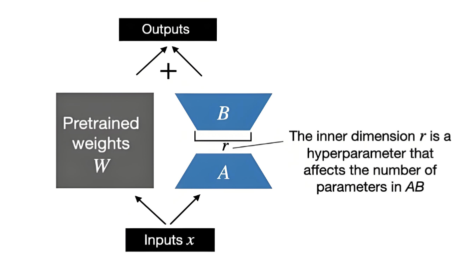 LoRA(Low-Rank Adaptation):核心思想是假设模型微调过程中的参数更新是低秩的。它冻结预训练模型权重,向模型注入可训练的低秩分解矩阵(A和B),只训练这些新增的参数。大大减少了可训练参数量(通常<1%)。