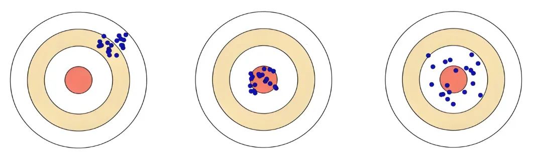 中列(理想):弹孔紧密集中在靶心附近,既精确又稳定。低偏差,低方差。