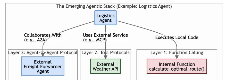 上述模型描述的是“概念层”的通信方式,而在实践中,交互的落地依赖一个正在形成的新兴技术栈。正如我们之前介绍的,这个技术栈由互补的多层构成,支撑不同形式的交互。这里我们重新回顾这些层,并说明它们如何在实践中促进“智能体-工具”和“智能体-智能体”的通信: