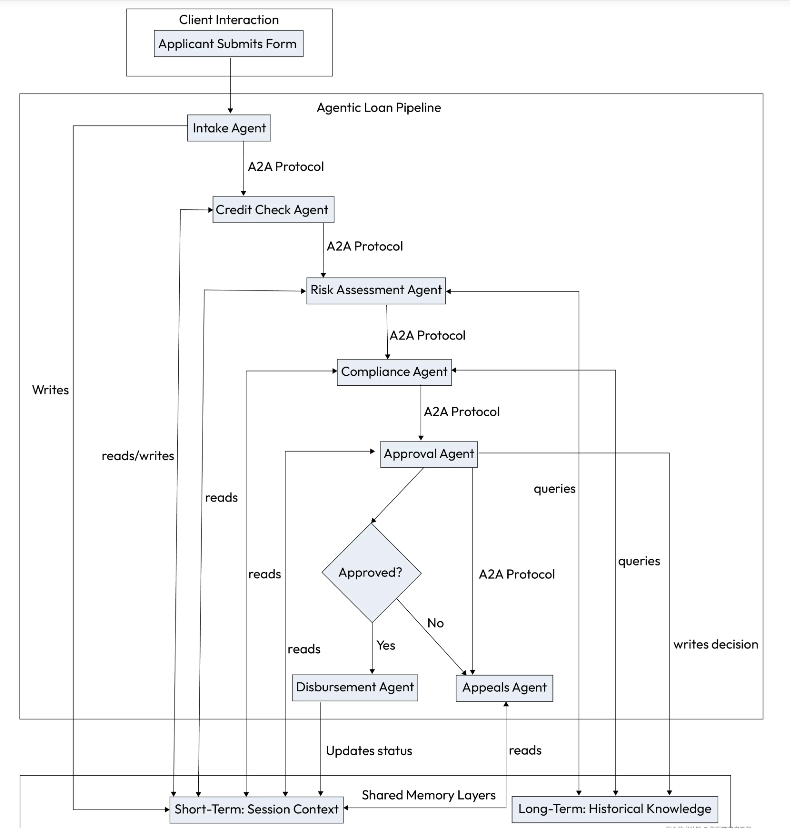 一家金融机构部署了一个多智能体系统,用于自动化并优化其贷款申请流程。该工作流从最初的客户交互一直延伸到最终放款,涵盖数据核验、信用评估、风险评分、合规检查与最终审批等环节。每个智能体专注于流水线中的一个明确阶段,并使用A2A协议进行通信与任务协调,同时访问共享记忆层以保持上下文一致。