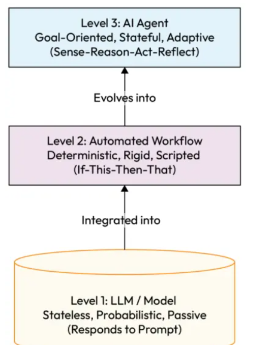 必须清楚地区分智能体式AI、简单LLM交互以及传统自动化工作流。尽管三者——LLM、自动化工作流与AI智能体——都在现代系统中扮演角色,但它们代表了根本不同的能力与自主层级,如下述层级结构所示。