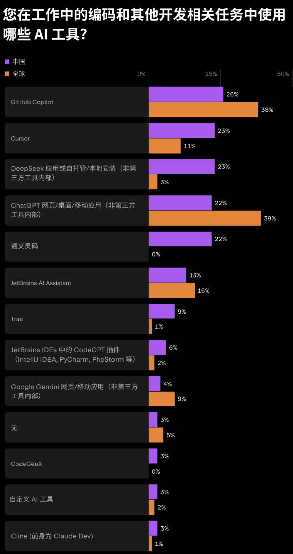 在 AI 工具方面,GitHub Copilot 在中国的使用率为 26%,低于全球的 38%。Cursor 的使用比例则达到 23%,明显高于全球的 11%。ChatGPT、Claude 等海外工具在中国的使用率相对较低,DeepSeek(深度求索)和通义灵码等本土方案则被更多开发者选择。