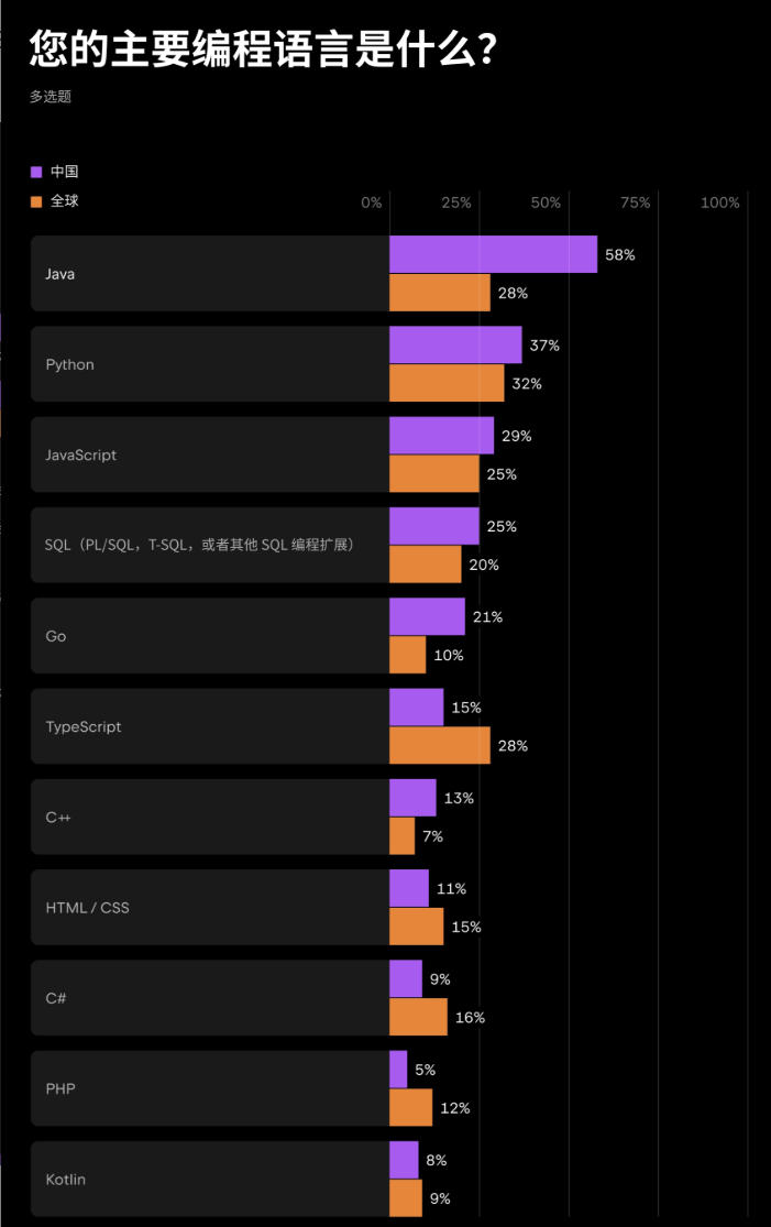 在全球范围内,Java 依然是使用广泛的开发语言之一,数据显示,约 27.76% 的专业开发者将 Java 作为主要开发语言,与 JavaScript、Python 形成相对均衡的分布。而在中国,58.17% 的中国开发者将 Java 作为首选语言,优势明显高于其他语言。这也解释了为何 IntelliJ IDEA 在中国开发者群体中,长期被视为 Java 项目开发的默认选择之一,尤其是在企业级系统和复杂业务代码维护场景下。