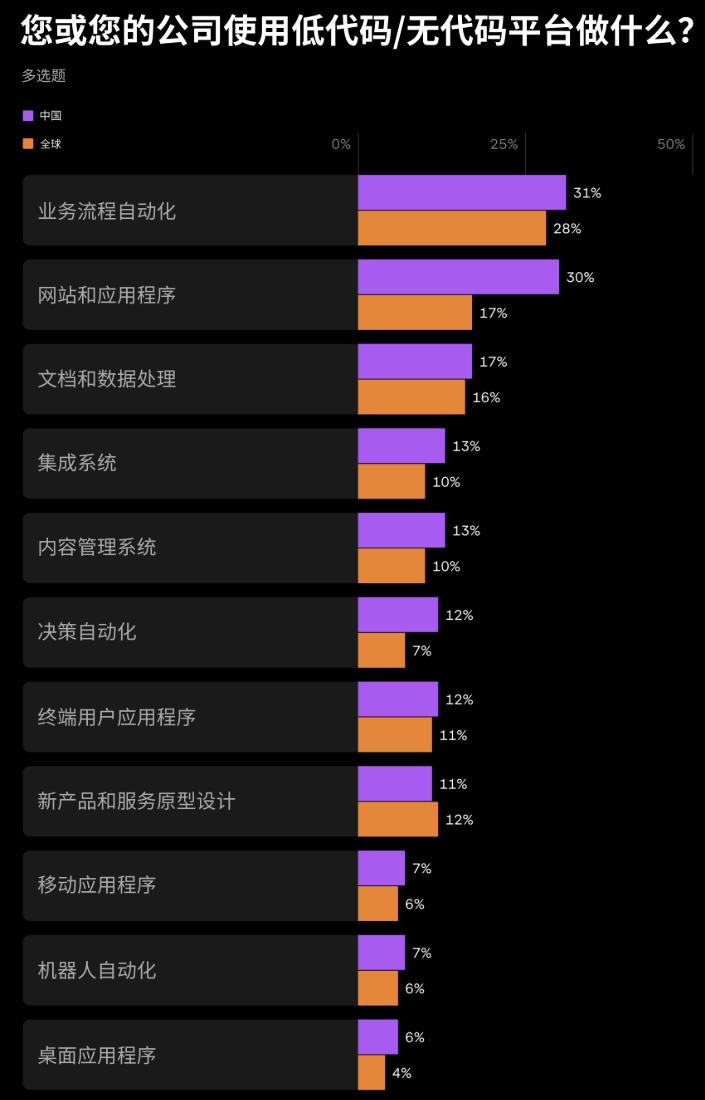 与全球平均水平相比,中国开发者对低代码/无代码平台持更积极的态度。中国开发者使用低代码/无代码工具构建应用的比例为 17%,高于全球的 10%;同时,有 14% 的中国开发者会开发相关系统供他人使用,而全球这一比例为 4%。无论在中国还是全球,业务流程自动化都是最常见的使用场景。