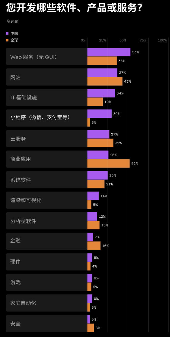 业务方向上,中国市场中,39% 的开发者从事 B2B 业务,28% 从事 B2C 业务,这也使开发工具在性能调试、稳定性和代码可维护性方面受到更多关注。