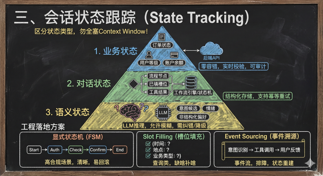 | 2. 对话状态 | 流程节点、已填槽位 (Slot)、工具返回结果 | 工作流引擎 / 状态机 | 结构化存储,支持幂等重试 |