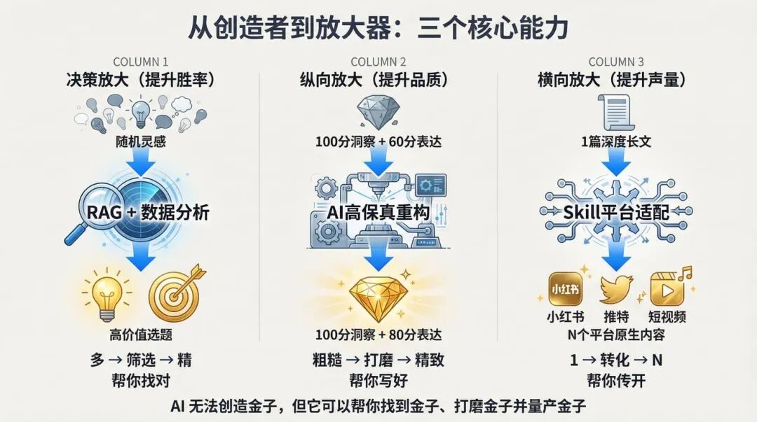 如果定位为创造者(直接0到1),AI 只能产出平庸的废话。而作为放大器,就可以利用**当下的技术红利,**实现3个放大: