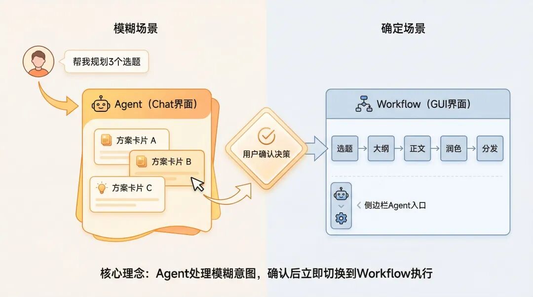- 交互克制:拒绝全自动黑箱,建立Agent处理模糊意图 + Workflow 锁死执行边界的人机共驾模式。