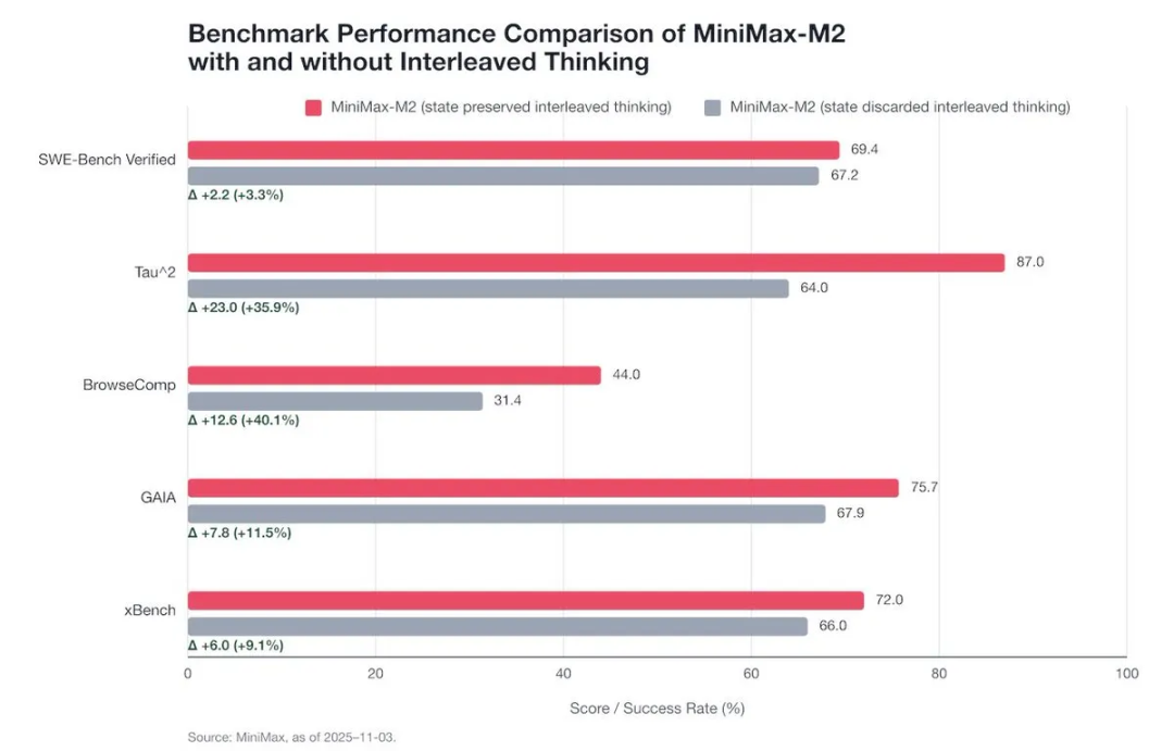 有没有带 thinking 内容,对效果有多大差别?MiniMax-M2提供了他们的数据: