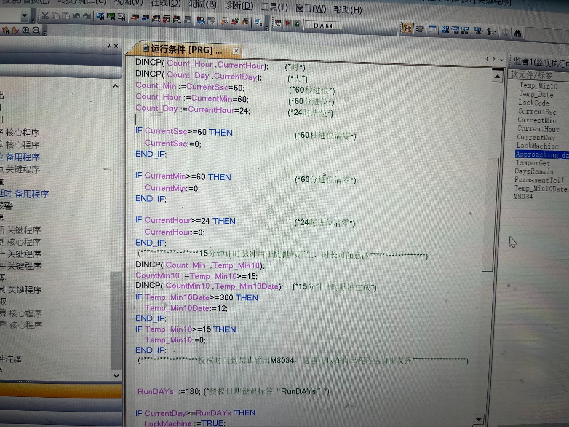 - 当授权日期达到时,标签“CurrentDay”接通,三菱PLC的M8034禁止所有输出(当然也可以在自己程序里做任意停机修改)。