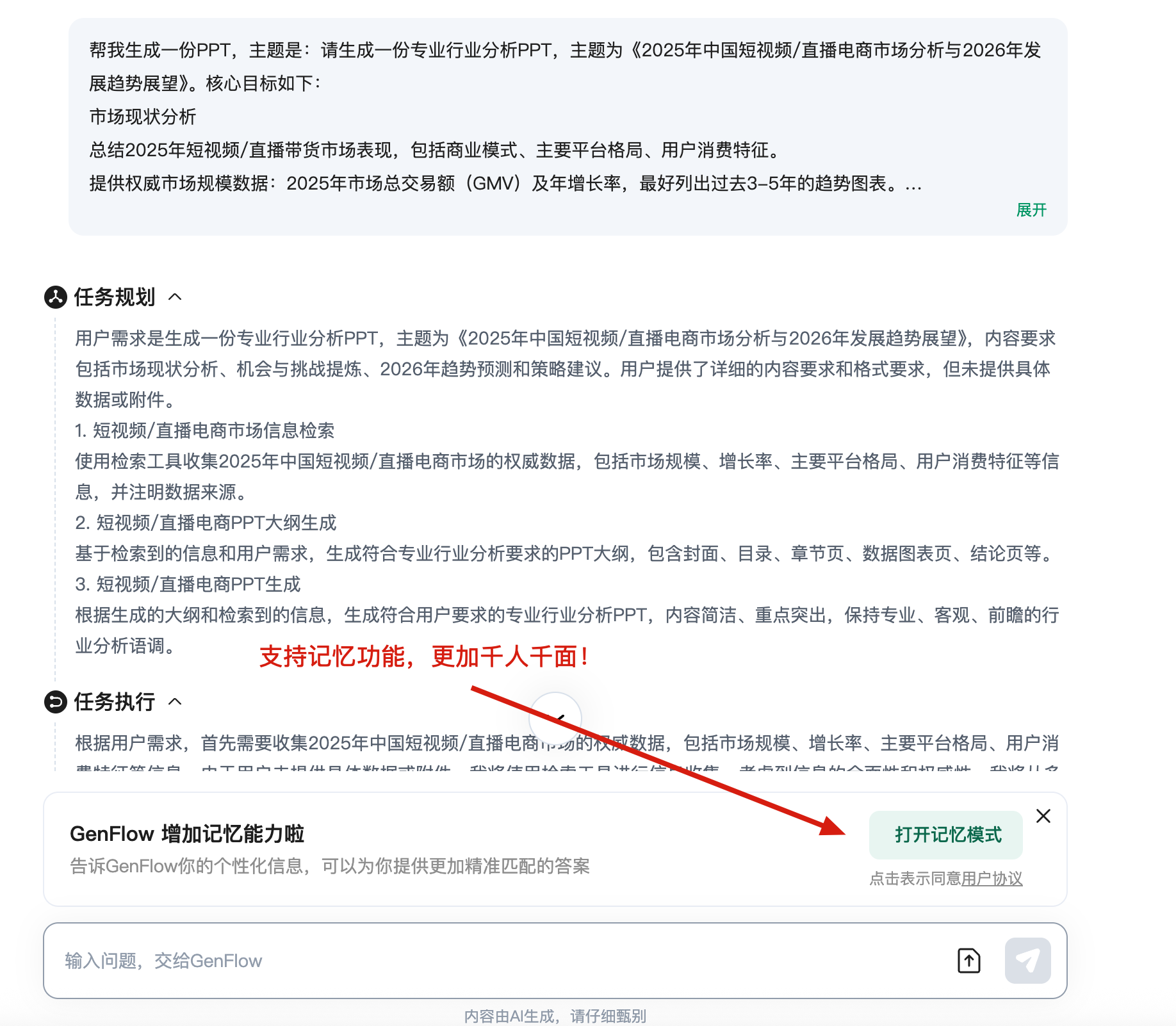 文库的专业模式是基于GenFlow通用智能,可以打开记忆模式,据说生成的PPT会更加千人千面,的确被拉到了下一个级别!