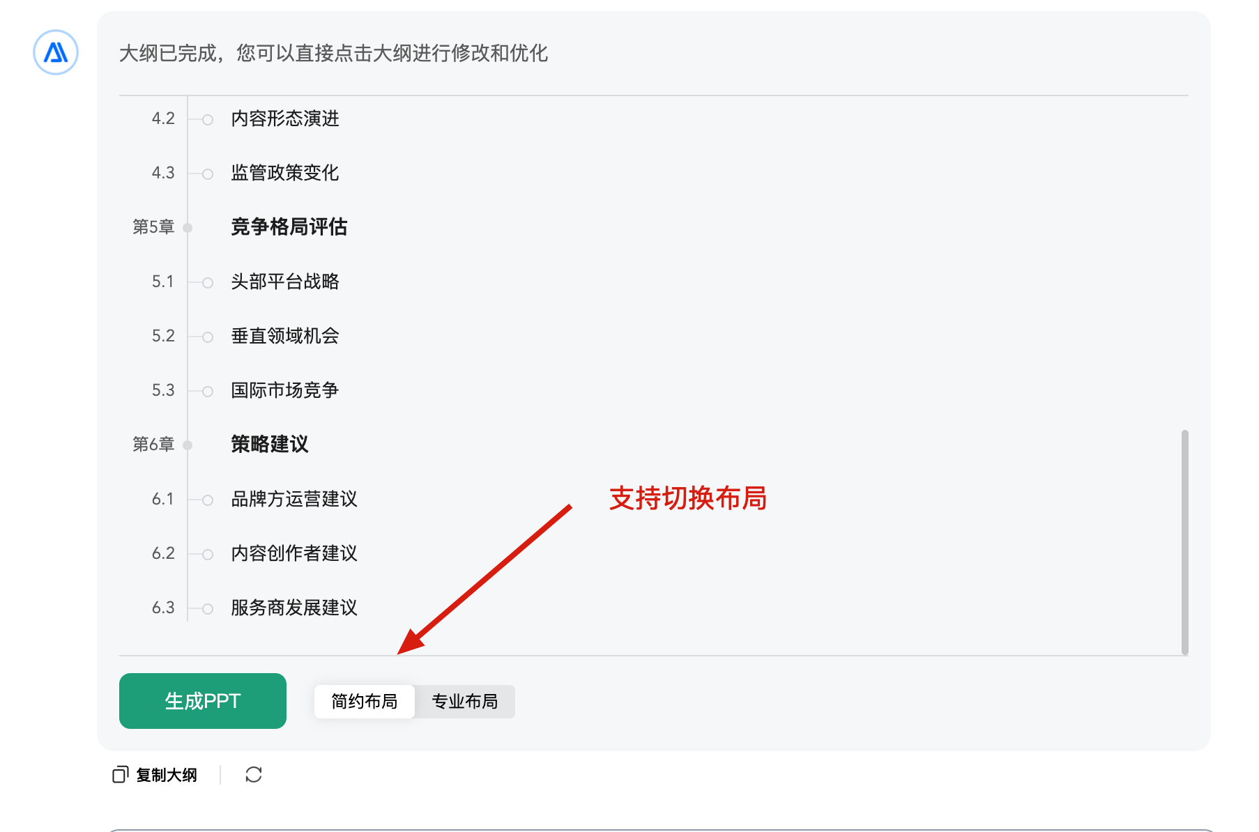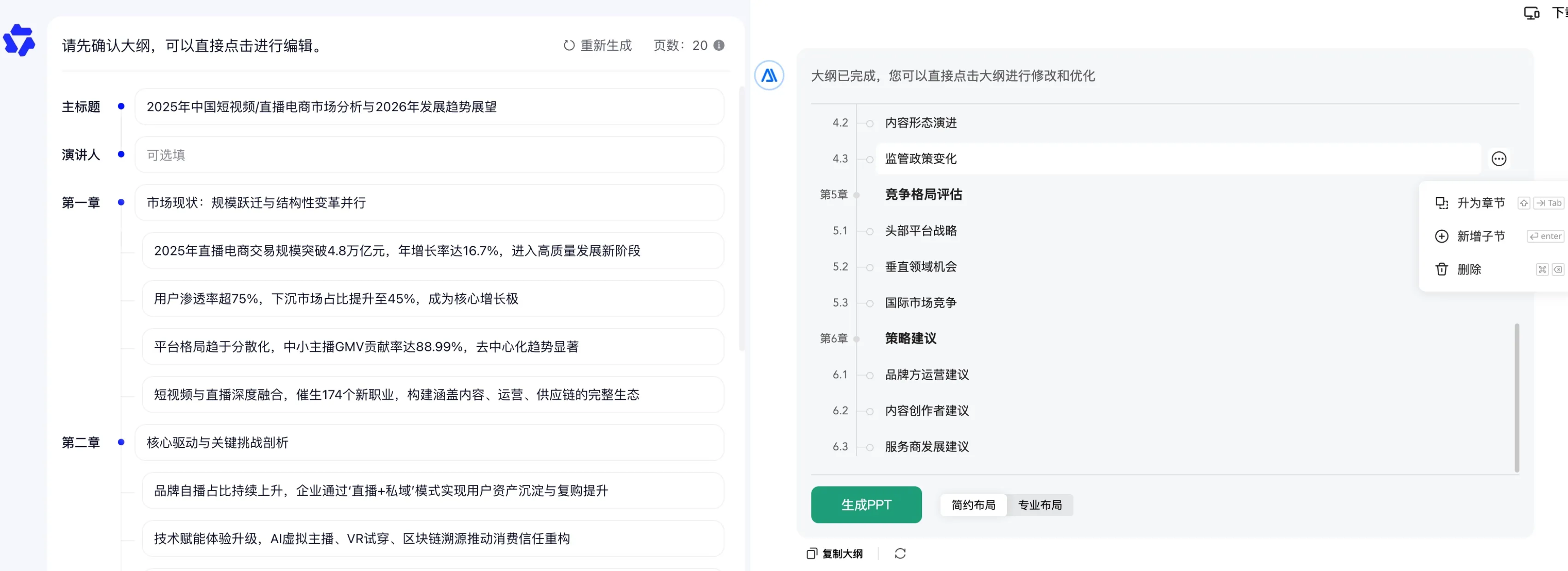 两个产品的经典模式都会先生成 PPT 大纲,也都支持修改。