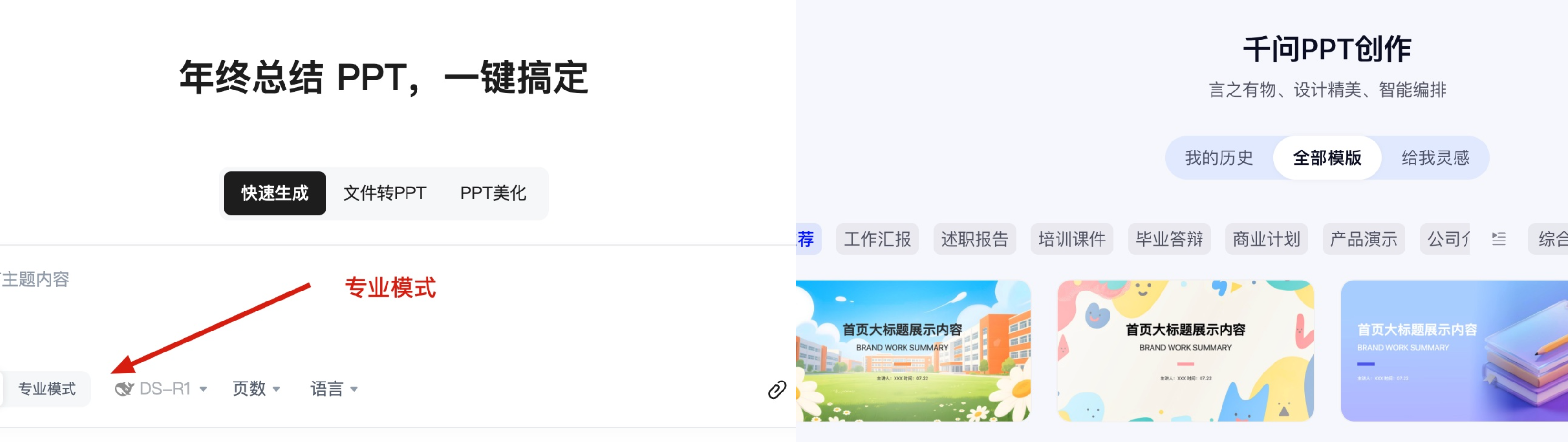 打开入口界面,可以看到,在使用页面上,千问目前支持传统模版生成,文库可以选择经典或专业模式生成,两个平台风格和模版都很丰富。