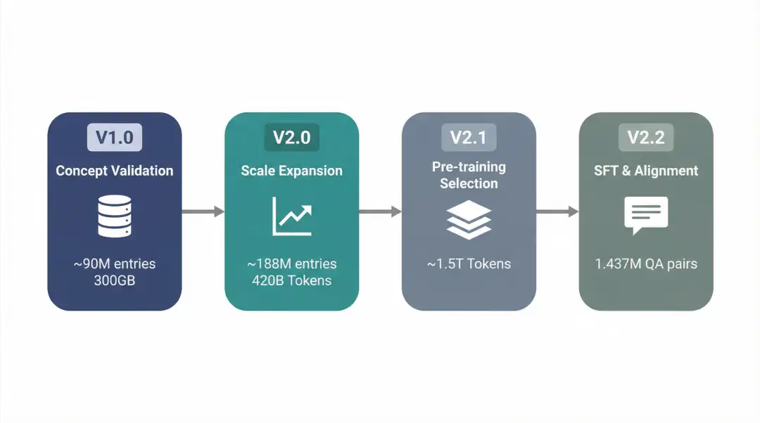 在 SFT 数据方面,V2.2 版本采用“质量至上”策略:只选取评分最高的 Top 0.1% 语料作为种子,利用 DeepSeek V3.2 的阅读理解能力,严格基于原文 Context 生成问答对。不同于自由生成的聊天数据,V2.2 的每一条数据都有确凿的原文依据,有效避免了模型幻觉和事实错误。