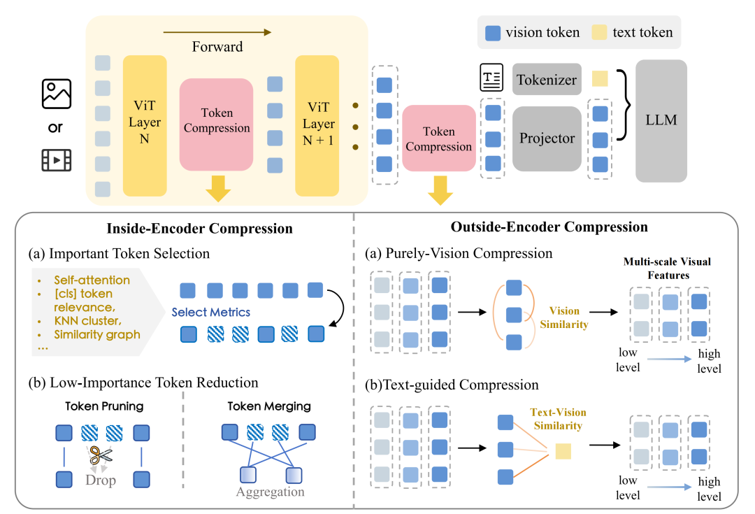 现有方法根据其是否利用了文本信息(用户指令)可分为纯视觉压缩和文本引导压缩,这两种策略是互补的,一种实用的设计是:首先通过纯视觉压缩导出紧凑的视觉表示,然后在语言模块中应用文本引导的选择机制,以精炼出与给定文本查询相关的 Token。