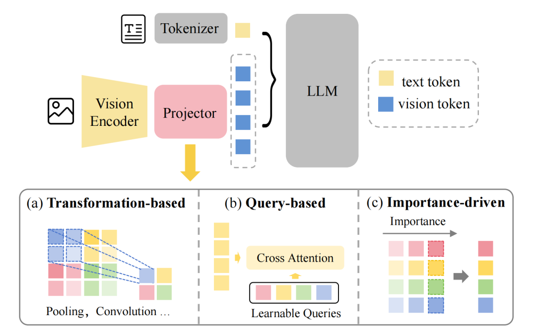 Projector module 作为一个接口,将原始的视觉嵌入转换为与语言兼容的表示形式,从而确保 vision encoder 提取的信息能被大语言模型有效利用。虽然像 Q-Former 这样的早期 projector 架构通过将大量的视觉嵌入提炼为一组紧凑的查询 Token,实现了高效 Token 压缩,但后续的大量研究为 projector 引入了额外的设计增强,以实现更细粒度和任务自适应的压缩。研究人员将这些方法大致分为三大类并进行了详细的讨论:基于变换的方法,基于查询的方法和重要性驱动的方法。