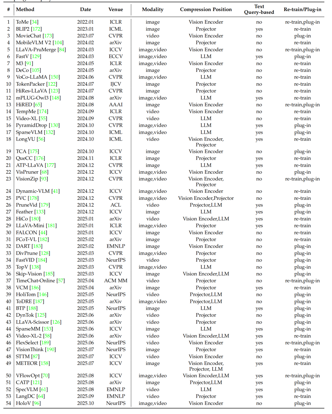 正是这种紧迫的需求催生了 MLLM Token Compression ,迅速成为研究爆点,两年内在该垂直领域产出了约 200 篇论文。但是随着研究工作的快速涌现,领域内的方法也变得极其庞杂难以归类,进一步具体到落地场景里面,往往因为方法多样而难以选择。