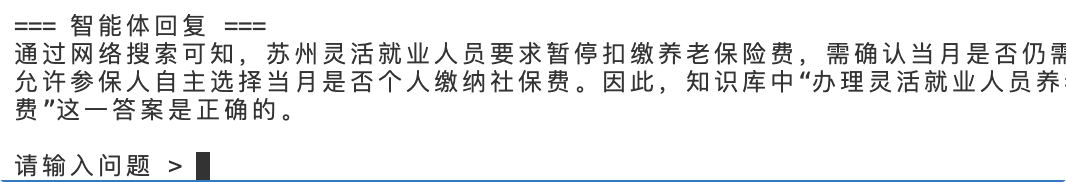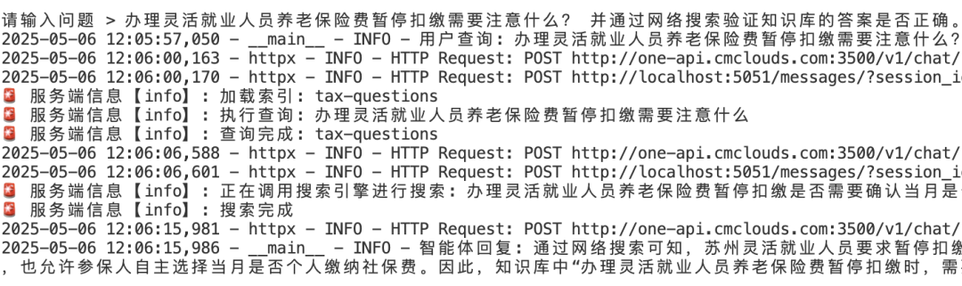 日志显示,Agent先用本地向量索引查询,然后通过搜索引擎对比,非常准确。