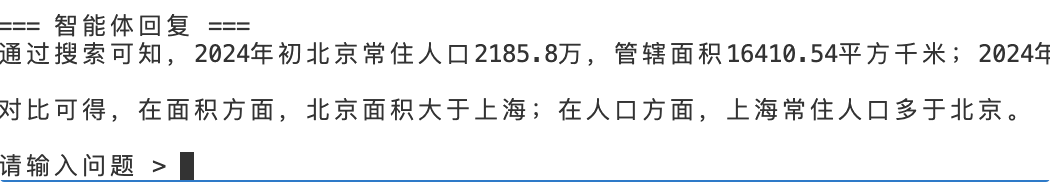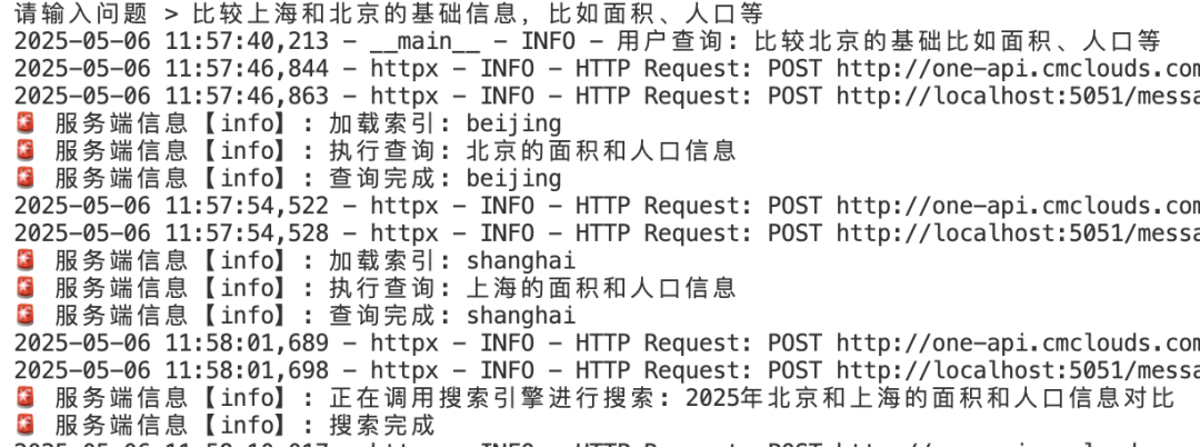 由于提供的文档有北京和上海的城市信息介绍,所以看到这个问题调用了北京和上海的RAG管道查询,还自作主张的调用了搜索引擎做补充,然后输出答案: