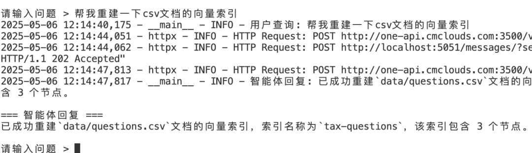 由于我们把创建索引的过程“工具”化了,所以甚至可以用自然语言来管理索引。比如这里我要求把csv文档的索引重建,智能体准确的推理出工具及参数,并重建了csv文档索引(实际应用要考虑安全性):