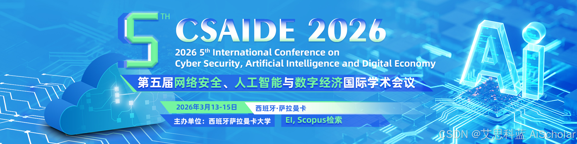 【会议通知】第五届网络安全、人工智能与数字经济国际学术会议(CSAIDE2026)将于2026年3月13-15日在西班牙萨拉曼卡大学线上线下同步召开。会议主题涵盖网络安全、人工智能算法、数字经济三大领域,由IEEE Fellow支持,延续ACM出版传统(ISBN:979-8-4007-2206-6),并确保EI/Scopus双检索。投稿主题包括密码学、机器学习、智能系统等前沿方向。录用文章作者可免
