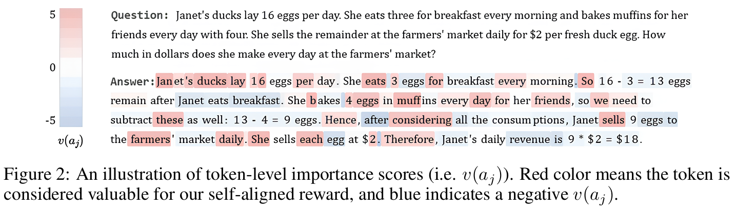 如下图(参考文中图2)所示,红色标记的Token表示对 RSAR_{SA}RSA 贡献大,蓝色表示贡献小。- 高分Token:首次利用题目信息的Token(如题目中的具体数字)。
