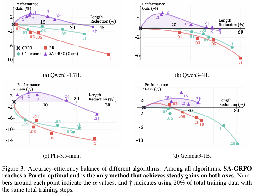 - 准确率与效率双赢:SA-GRPO在准确率上比标准GRPO高出约2-3个百分点,同时长度减少了约15%-30%。