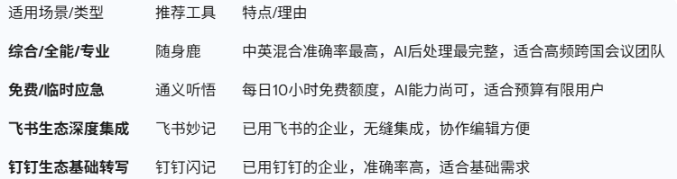 - **综合/全能/专业首选**:随身鹿(中英混合准确率最高,AI后处理最完整,适合高频跨国会议团队)