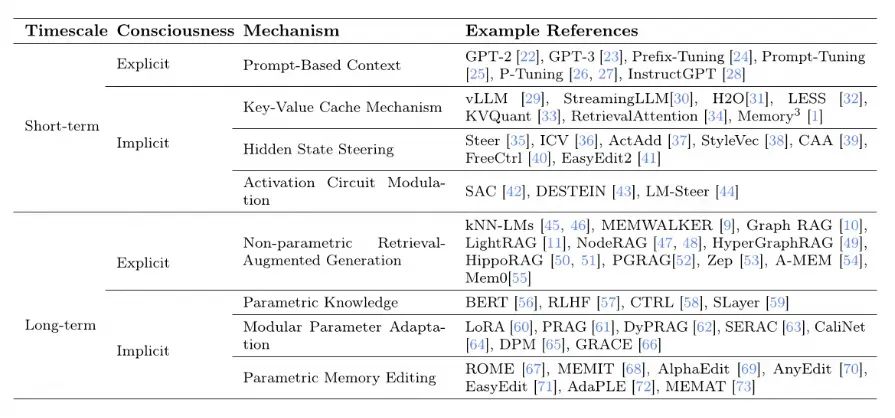 以下是截取自 MemOS 论文中对现有记忆实现的分类: