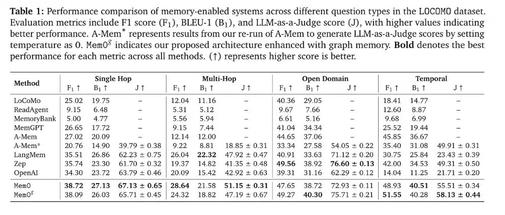 ZEP 号称更满足企业内的需求,传统的 RAG 是基于静态的文档数据,ZEP 能够根据对话和 Bussiness Data 来获取更实时的信息。它的主要创新在于记忆的存储结构,底层自研了一个图引擎 Graphiti,能够提供时间感知的知识图谱。由于在它之前也就 MemGPT(上面的 LETTA)表现比较优异,所以论文中主要与其做对比。DMR Benchmark 比 MemGPT 表现更优,94.8% vs 93.4%。同时在 LongMemEval benchmark,这是一个更符合企业用例的测试,包含一些复杂的时间推理任务,通过 ZEP 准确度提升了 18.5%。