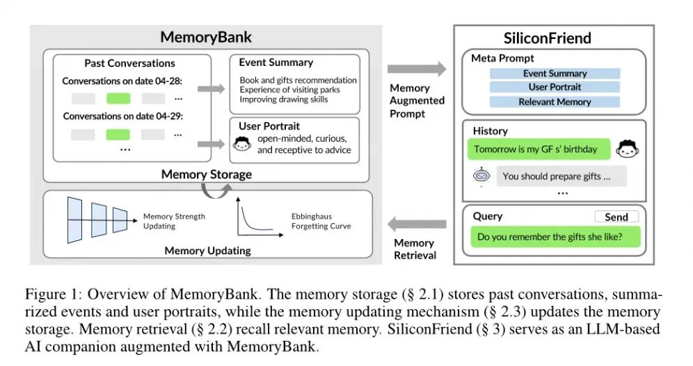 Memory Bank 提出的实现有几个特点:1)能对对话进行总结和定期回顾,存储摘要以便搜索记忆,以及通过对话总结用户画像提供更个性化的回答;2)借鉴了艾宾浩斯遗忘曲线理论的心理学原理,实现了记忆遗忘机制,模仿人类认知过程中的动态记忆机制。