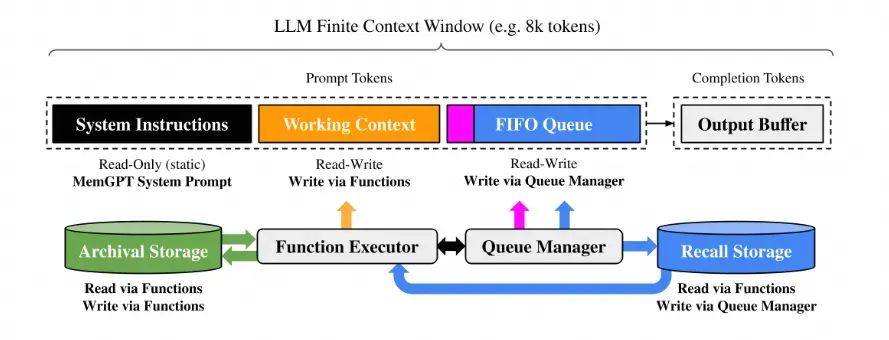 - 记忆的更新与提取:这个动作通过 Function Executor 来完成。记忆的更新与提取是完全自驱动的,通过在系统指令中给出提示词,提示词中会包含:1)记忆层次结构及其各自的用户的详细描述;2)系统可调用的函数,通过自然语言来描述,以让 LLM 能够访问和修改记忆。