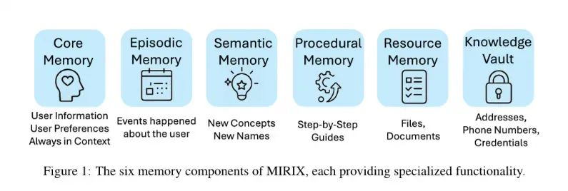 所以 MIRIX 内部将记忆分为 6 个不同的组件,并且采取 Multi-Agent 架构进行管理: