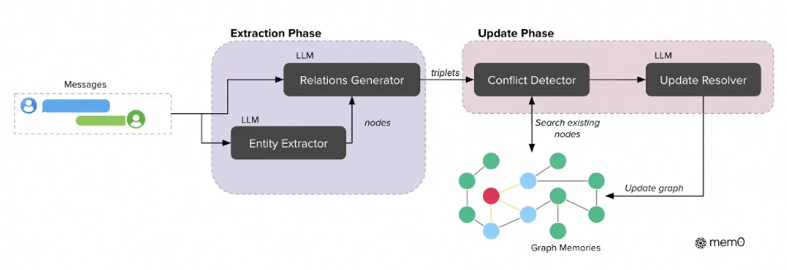 记忆去重:提取的语义实体会进行去重,避免存储冲突的记忆。对实体的去重会通过对实体名和实体摘要进行全文检索来找到相似的实体,通过 LLM 进行判重,如果判定重复会更新当前实体的相关信息。
