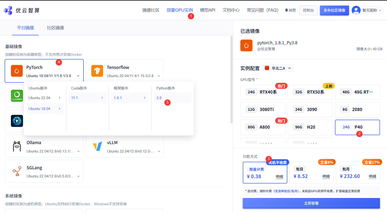 我这里便于演示选择最便宜的P40,基础镜像里选择Pytorch,Ubuntu、Cuda版本选择你最熟悉的(尽量不要选太低的系统版本,可能在vscode连接时有些问题,这里为了演示选择ubuntu18)