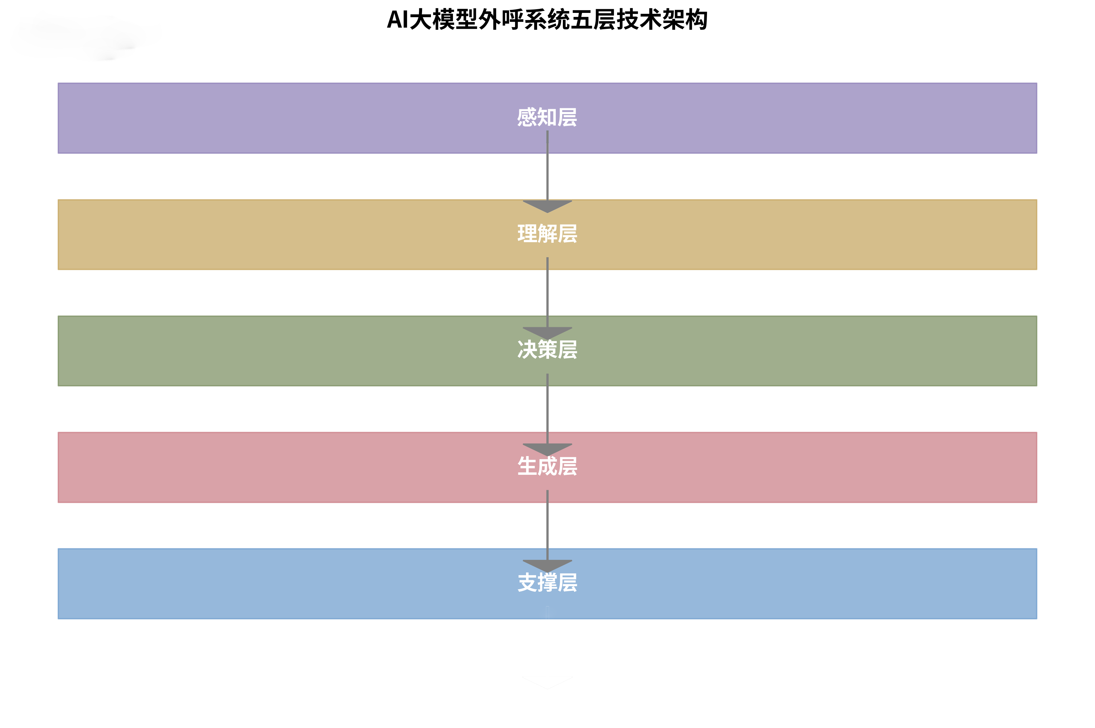图:AI大模型外呼系统五层技术架构图,展示了从感知层到支撑层的完整技术栈