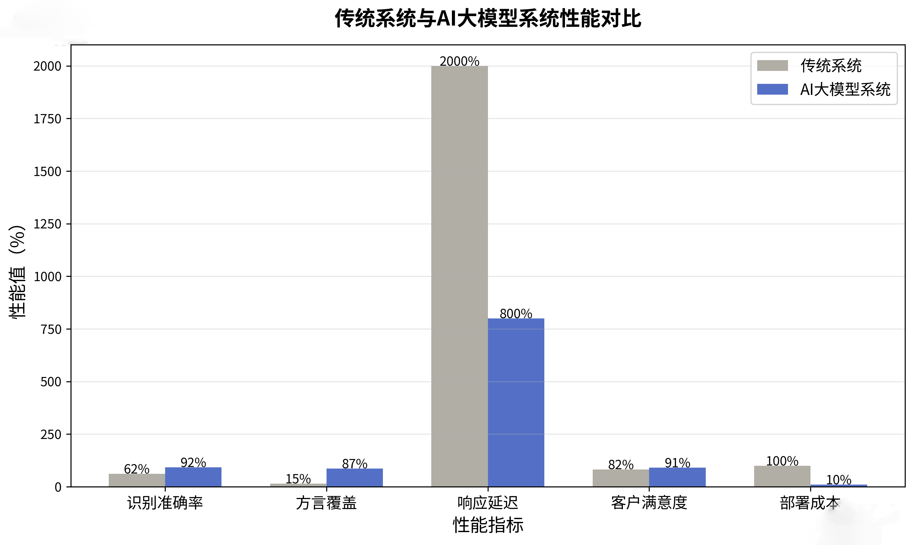 图:传统系统与AI大模型系统在关键性能指标上的对比,显示了大模型技术带来的显著提升