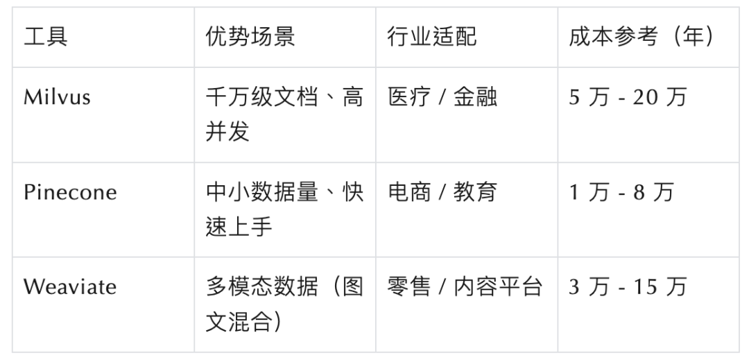 对比数据:Milvus 本地部署 0.3 元,Pinecone 0.8 元,Weaviate 多模态 1.2 元。