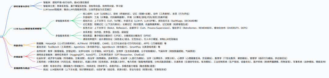 本综述聚焦基于大型语言模型(LLM)的智能体,明确其作为通往人工通用智能(AGI)的核心潜在路径,帮程序员搭建完整的LLM智能体知识框架。内容上,系统梳理了单智能体与多智能体系统的定义、研究框架及核心组件(含规划、记忆、反思、工具使用、环境交互五大核心,小白可重点记这5点),对比了LLM-based智能体与强化学习(RL)智能体的优劣的同时,补充了实际应用中的选型建议;详细阐述多智能体系统中角色协作、消息传递及通信效率提升的实用策略,介绍了小白入门可实操的主流数据集与基准测试工具,拆解其在自然科学、社会科学、工程系统等领域的落地案例,点出LLM固有约束、动态扩展、安全信任等实际开发中会遇到的挑战,并给出未来学习重点——持续学习、多模态融合等发展趋势,助力程序员精准发力。