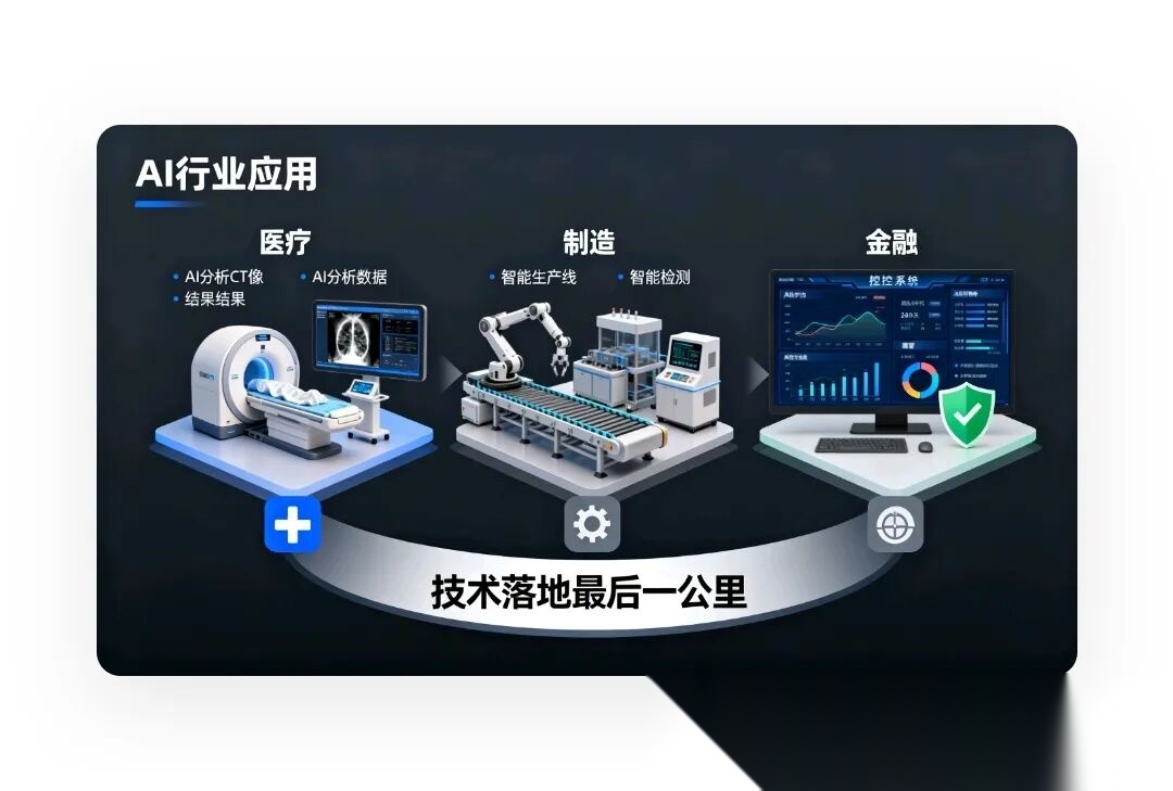 前面4个都是“技术层”,而行业应用是把AI技术用到具体场景里,比如医疗、制造、金融这些领域,也是普通人最容易切入的赛道。