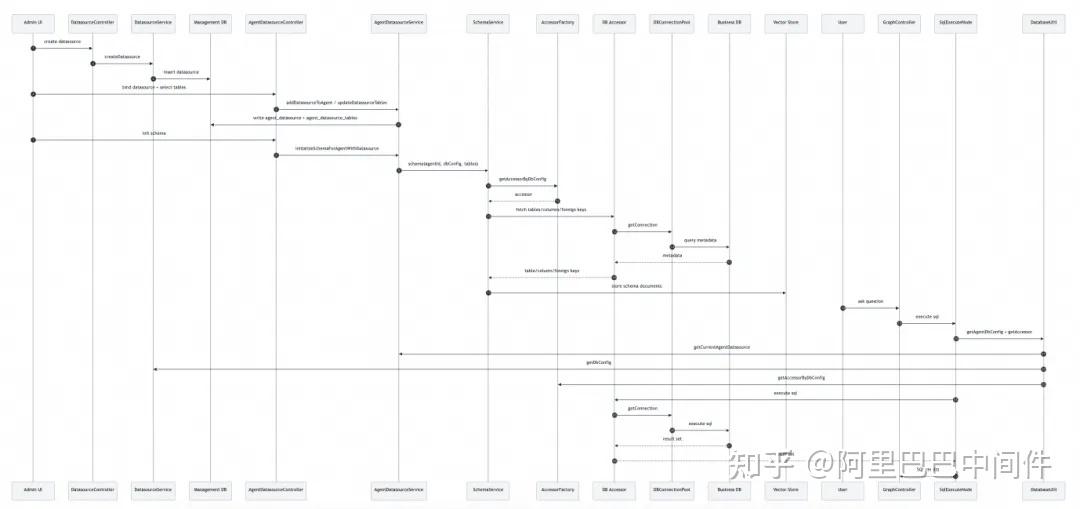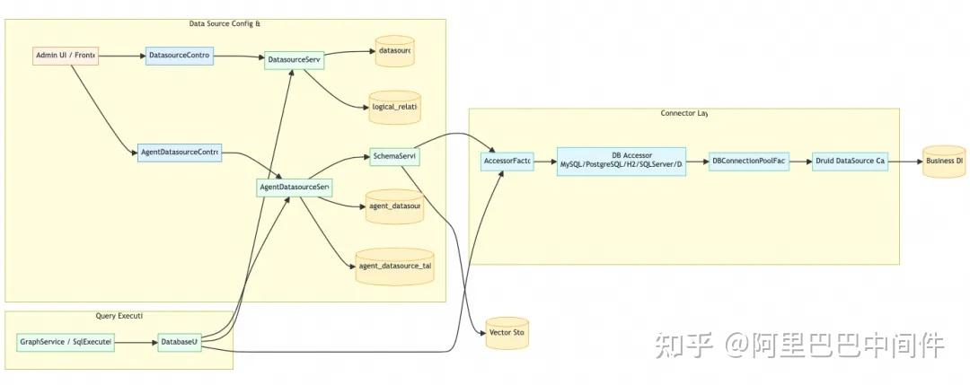 对应的 Accessor + DBConnectionPool 负责不同数据库协议与方言的访问。 - Schema 初始化:AgentDatasourceController 触发初始化,SchemaService 通过 AccessorFactory 拉取表/列/外键并写入向量库。