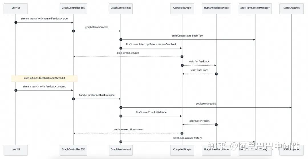 - 暂停与恢复:CompiledGraph 使用 interruptBefore(HUMAN_FEEDBACK_NODE),无反馈时进入“等待”,反馈到达后通过 threadId 继续执行。